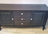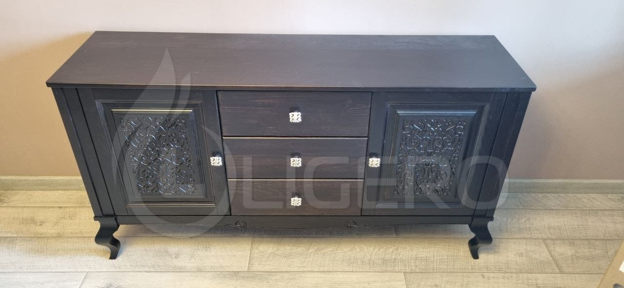 Комод из серии Шик из бука отличается роскошным внешним видом и высокой функциональностью. Его фасады украшены резными элементами, создающими визуальную лёгкость и утончённость. Центральные выдвижные ящики обеспечивают удобное хранение аксессуаров и мелких вещей, а просторные боковые секции подходят для более крупных предметов. Изгибы корпуса и ножек подчёркивают стиль и изящество. Металлическая фурнитура выполнена с использованием декоративных элементов, дополняя общий дизайн. Натуральные свойства бука гарантируют долговечность изделия.