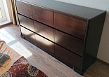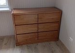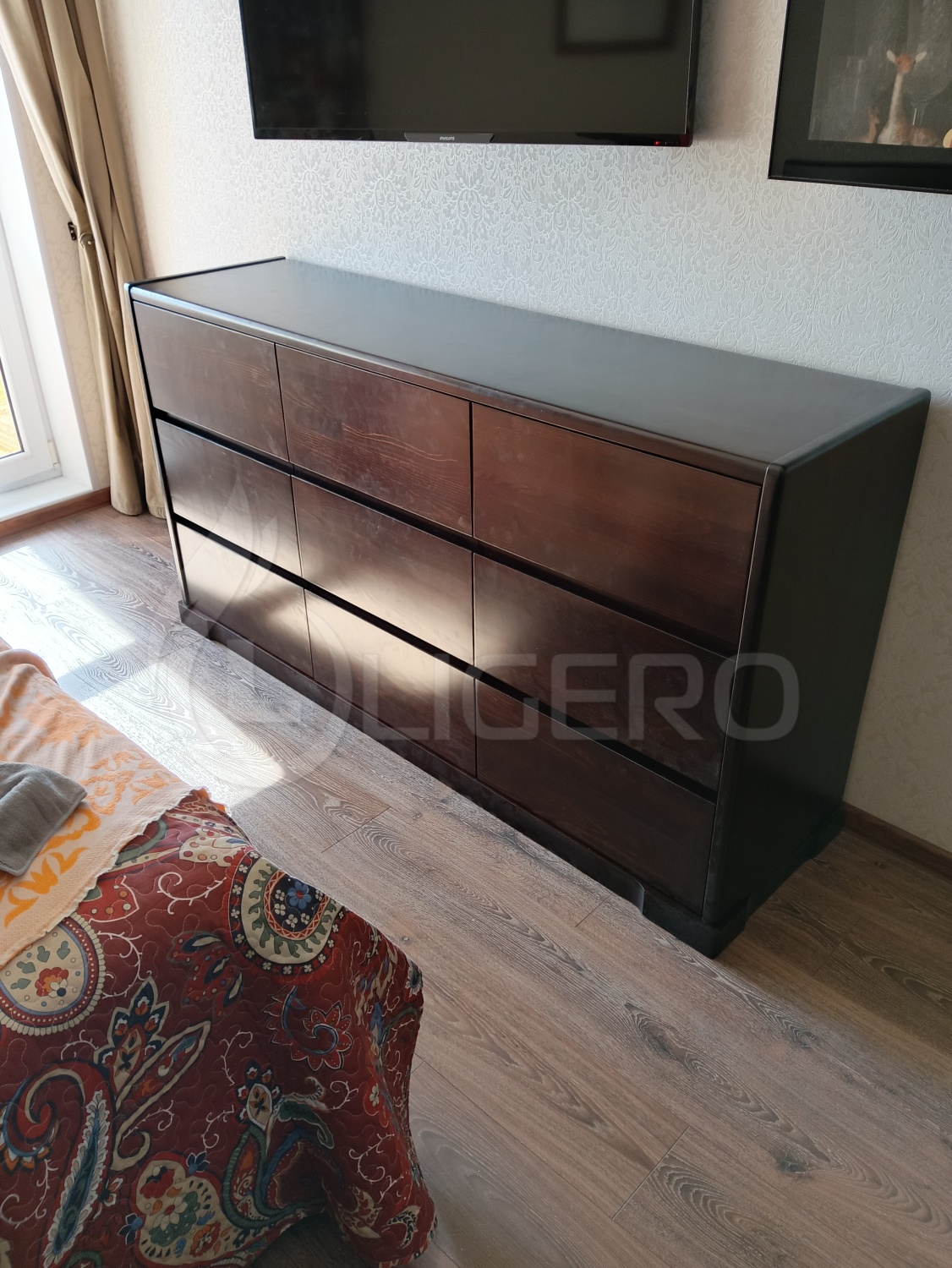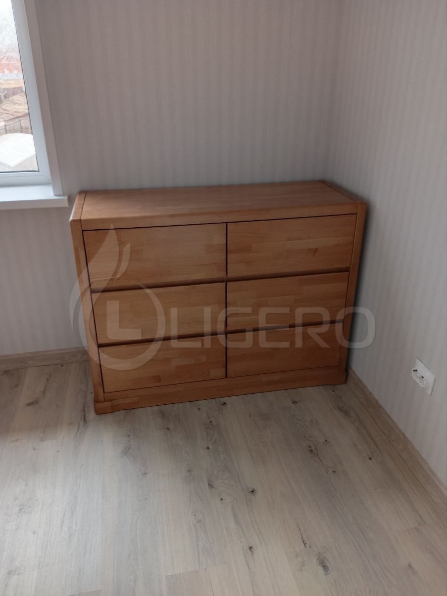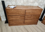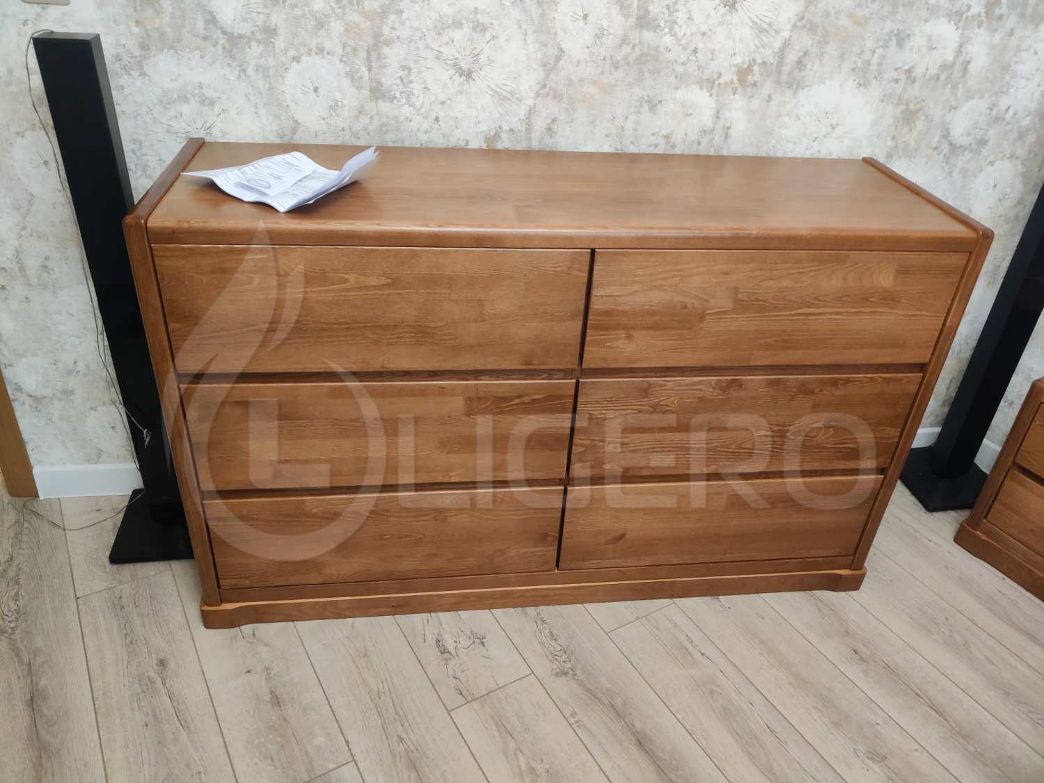 Комод имеет классический дизайн, оборудован 6 выдвижными ящиками и предназначен для хранения большого количества вещей. Он характеризуется высокой степенью вместительности. На одном уровне находятся по две секции. Каждая пара размещена не в плотную друг к другу. Данное дизайнерское решение заменяет стандартную фурнитуру.