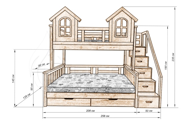 Эта двухъярусная кровать из массива бука предназначена для тех, кто ценит надежность и стиль. Лестница со встроенными ящиками помогает организовать хранение, а бортики верхнего яруса обеспечивают безопасность. Декоративные детали в виде домиков придают конструкции оригинальный вид, создавая игровую атмосферу. Буковая древесина известна своей долговечностью и устойчивостью к износу, что делает изделие подходящим для ежедневного использования. Такая кровать станет практичным решением для детской комнаты.