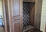 Конфигурация шкафа подойдет для размещения в холле или коридоре благодаря своим габаритам и функциональности. Главные конструктивные особенности изделия - это наличие двух отделений под верхнюю одежду, расположенных по бокам, а также место для размещения обуви и полка для головных уборов, аксессуаров. Умело дополняют дизайн каретная стяжка и тумба с мягким сиденьем.