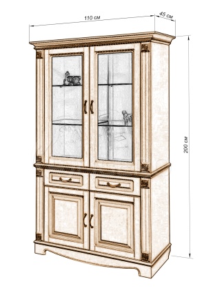 Сервант из бука отличается строгим дизайном и высокой надёжностью. Верхняя часть с застеклёнными створками защищает предметы от пыли, оставляя их на виду. Тщательно продуманная подсветка усиливает эстетику, выделяя детали интерьера. Ящики под витриной подходят для хранения небольших предметов, а нижний отсек добавляет вместительность. Применение бука обеспечивает долговечность и устойчивость к механическим воздействиям, сохраняя привлекательный вид на долгие годы.