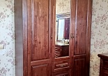 Большое внутреннее пространство разделено на место под хранение одежды в подвешенном состоянии, полки и выдвижные секции в количестве трех штук. Дополняет конструкцию зеркало, которое не только помогает привести внешность в порядок, но и зрительно расширяет пространство.